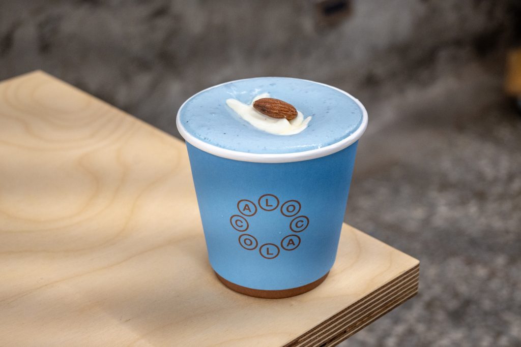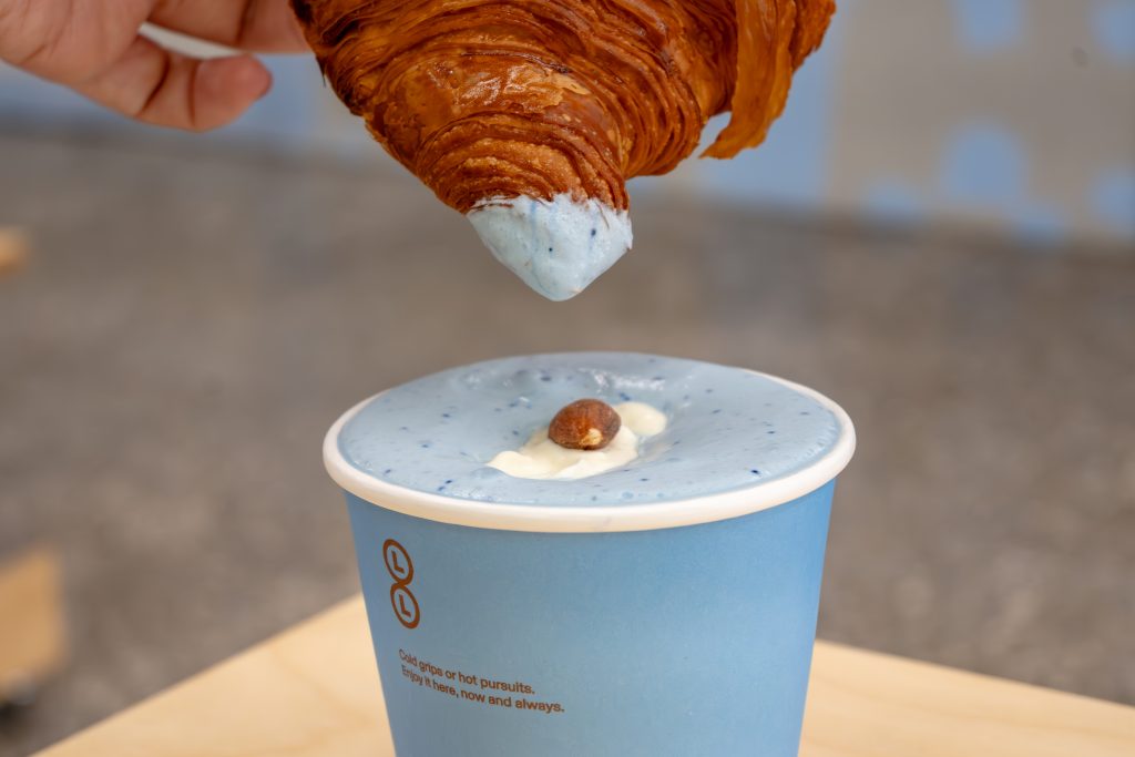 淺藍色的奶油覆蓋在椰奶與義式濃縮混合的醇香咖啡上,入口綿密香甜不膩,往下探尋,豐富的層次充滿口腔,隱藏版吃法是沾上酥脆口頌,鹹甜交織,淺藍色的幻想讓人欲罷不能。