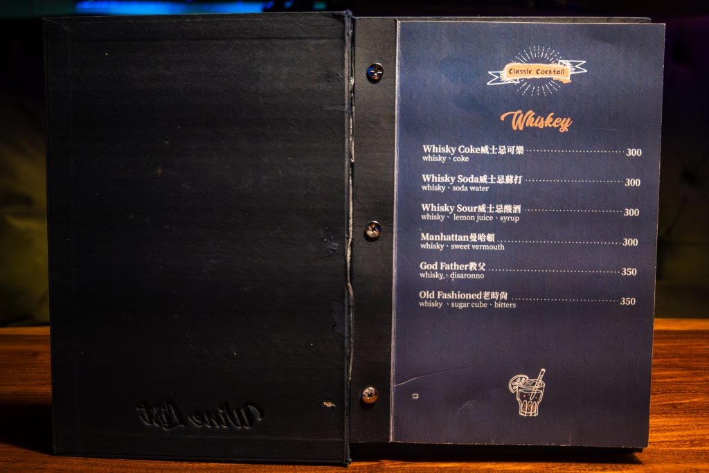 主要販賣的品項有海洋系調酒、GIN調酒、Whiskey調酒、Vodka調酒、Tequila調酒、Rum調酒、Strong Drink烈調酒、shot、啤酒、威士忌、伏特加、龍舌蘭、琴酒、白蘭地、無酒精飲料、開胃小菜、炸物、串燒、隱藏版美食(秘密),甚至很貼心供應醒酒湯品薑絲蛤蜊昆布湯。