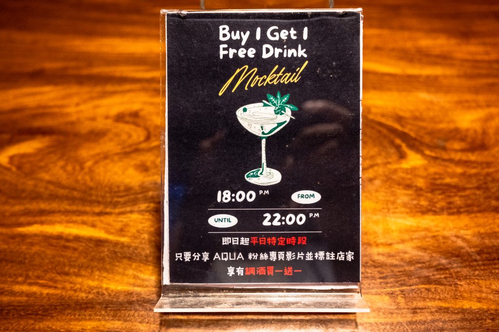平日晚上18:00-22:00,只要分享AQUA粉絲專業影片,並標註店家,即享有調酒買一送一。