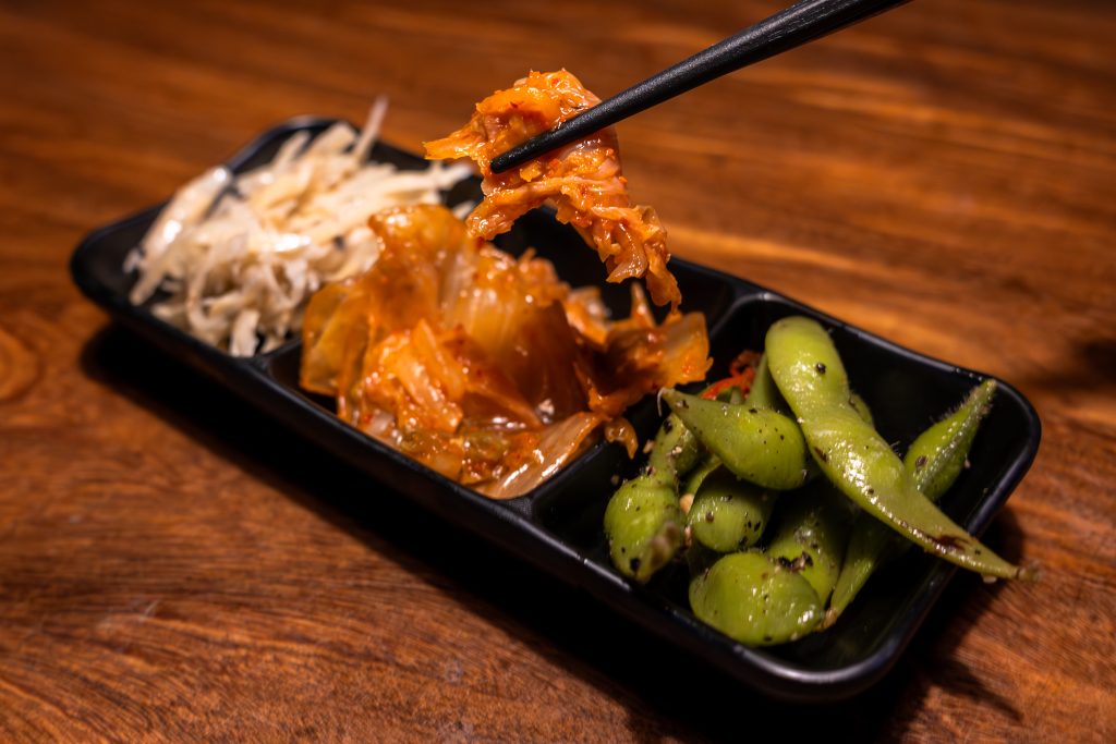 入座之後,AQUA Lounge會招待3樣開胃小菜(韓式泡菜、日式牛蒡絲、辣味毛豆),如果喜歡覺得不夠的話,可以使用QR code來加點。