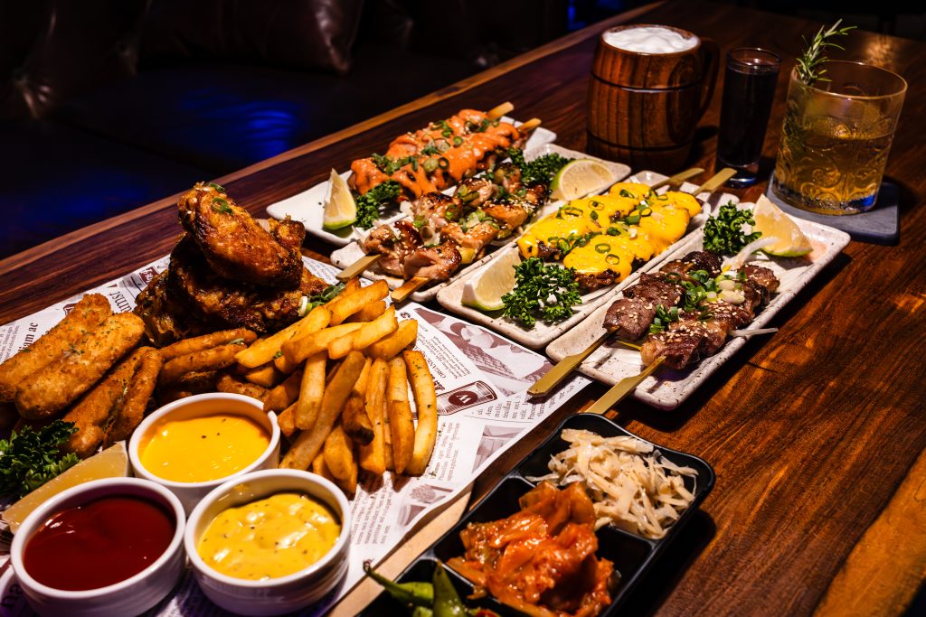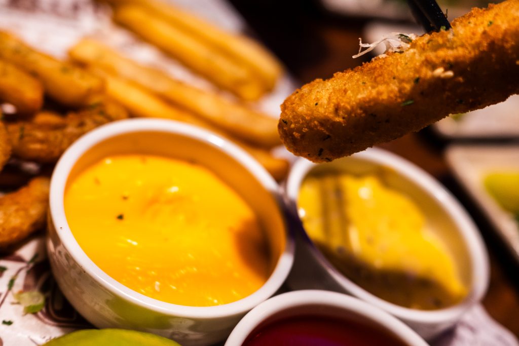 暢飲之夜,真不能少了美味炸物這元素,AQUA Lounge炸物拼盤可說是相當豐富,經典脆薯、酥炸洋蔥圈、唐揚炸雞、馬茲瑞拉起司條,鋪滿了整個木托盤,配上三款經典沾醬:番茄醬、蜂蜜芥末醬、起司醬,只要$380!!!超級划算的啦!