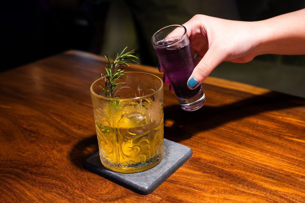 倒入的人造汙染源,是由浸泡過蝶豆花的椰子水製成。