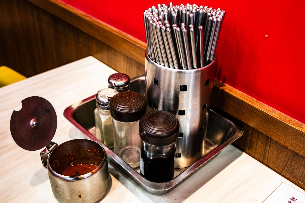 每張桌面上皆附有餐具、胡椒粉、烏醋、辣椒…等調味料。