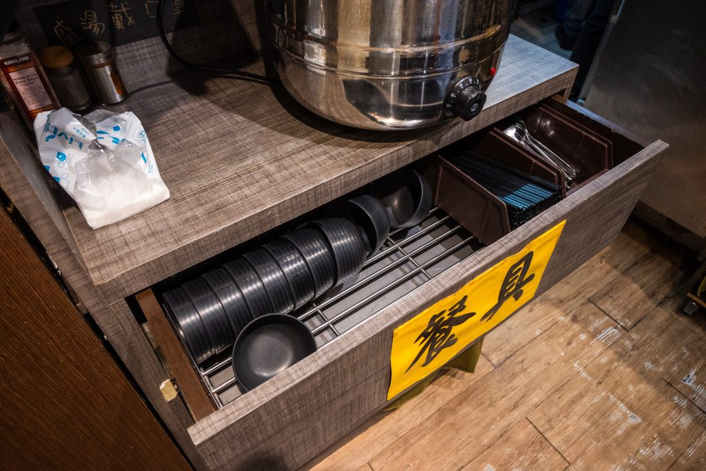 自助區供有味噌湯、冰水、調味料、衛生紙,餐具的部分也需要來此自行拿取。