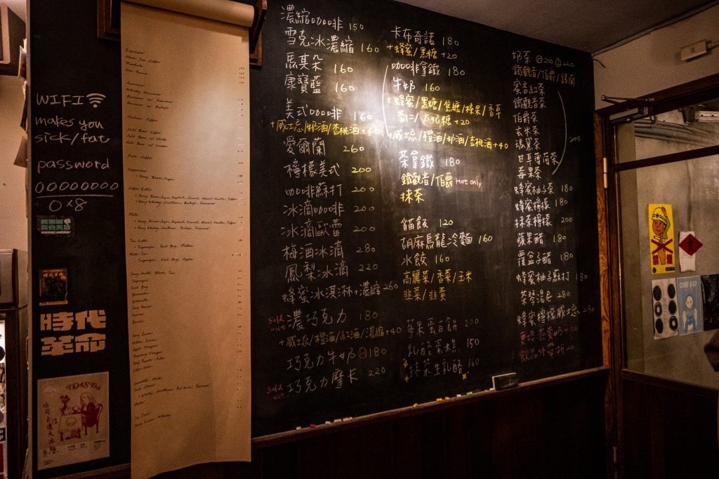未央咖啡店沒有供應紙本的菜單,所有選項都寫在進門後左手邊的黑板上,主要有黑咖啡、奶咖、巧克力、茶拿鐵、無咖啡因飲品、鹹食、甜點…等。