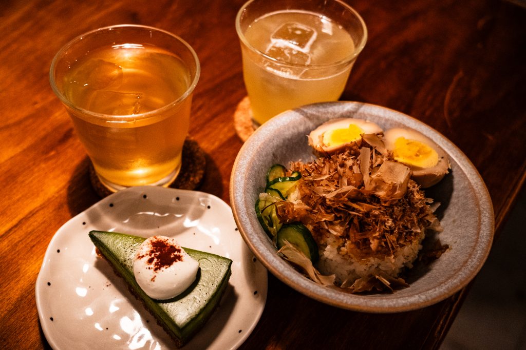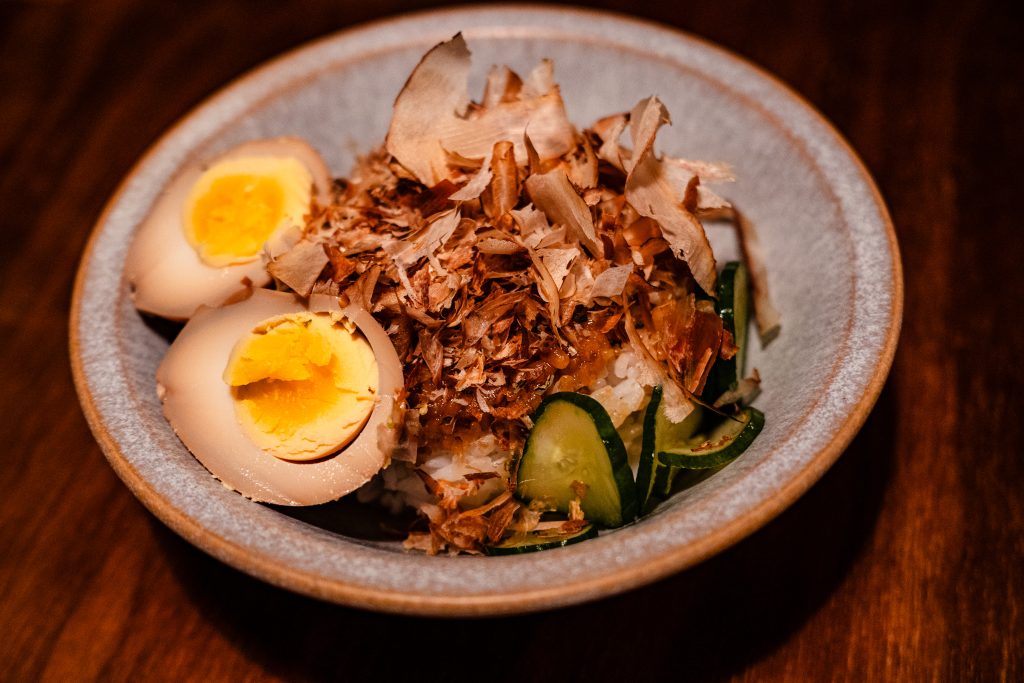 熱飯上灑滿了柴魚片,然後淋上醬油,擺上醃製小黃瓜、切半的溏心蛋,看似簡單卻很美味,料理的背後還隱含著一段艱辛的歲月。