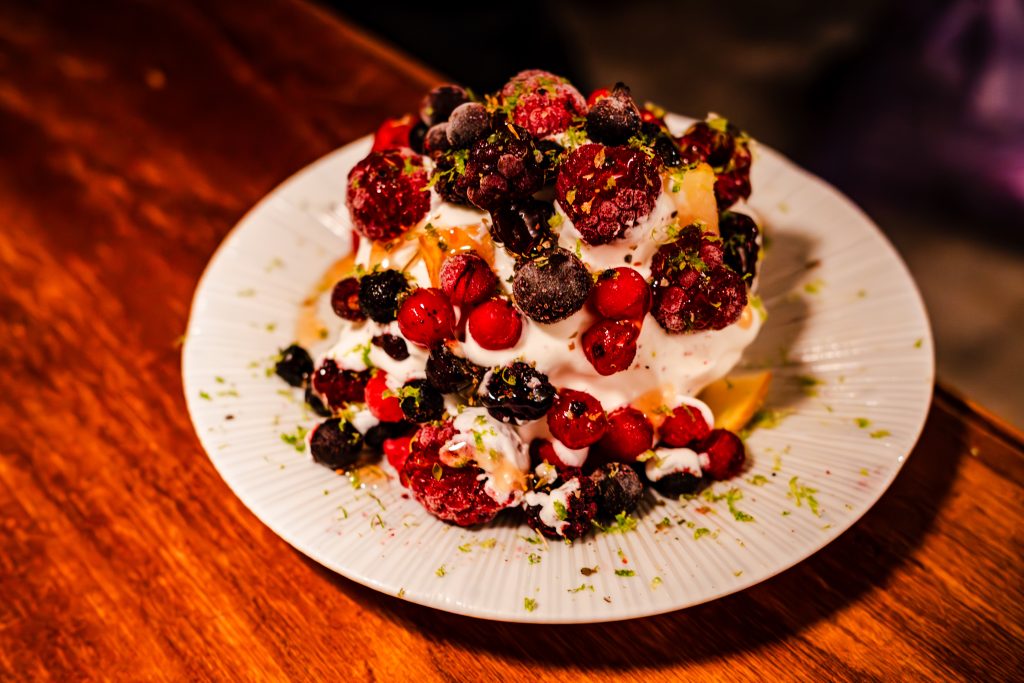 蛋白與白糖充分混和、打發,再經由低溫烘烤成型,營造出輕快、酥脆、甘甜的極致享受,配上鮮奶油、冷凍莓果的點綴,讓輕盈的口感,多了份厚重與酸甜。