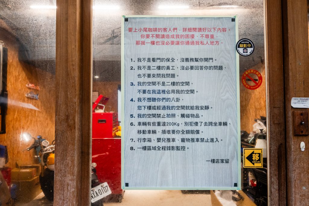想來小尾咖啡Tiny Tail你必須先當大尾客人,鼓起勇氣按下氣動門鈴,大膽從一樓機車行店中央路過,但請來訪的朋友們速速經過,不要在一樓停留造成店家的困惱。