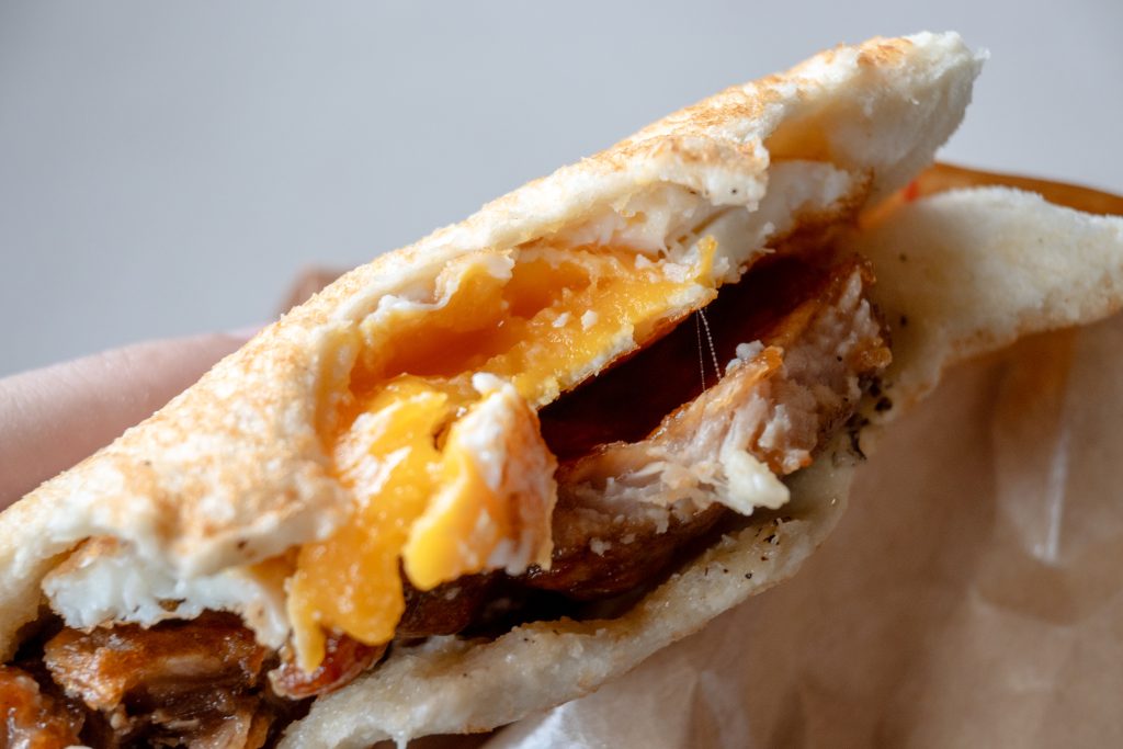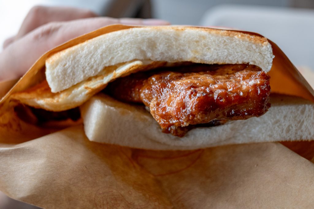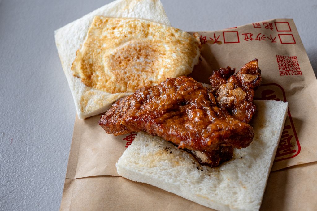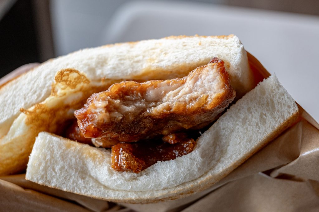 胡哥幫大家解剖開排骨吐司,結構很簡單粗暴,就是一塊超大炸排骨、半熟蛋、兩塊吐司,沒有花俏的調味,好吃全靠真本事。