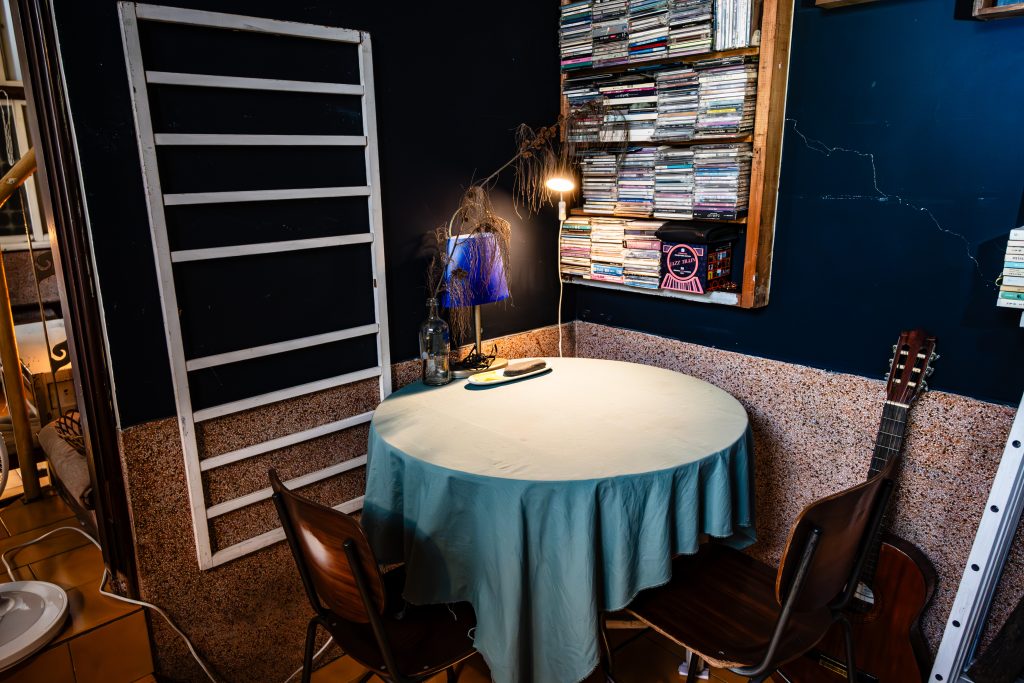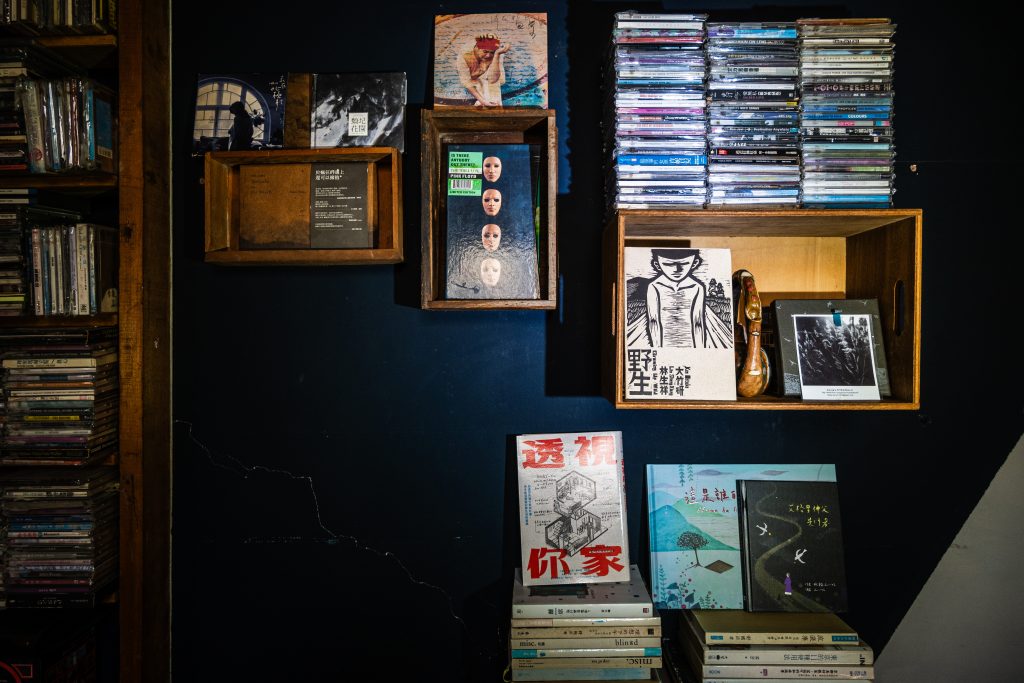 牆壁、木櫃上有堆疊著許多CD、DVD、海報,供來的人瀏覽,也當作開啟話題的契機。