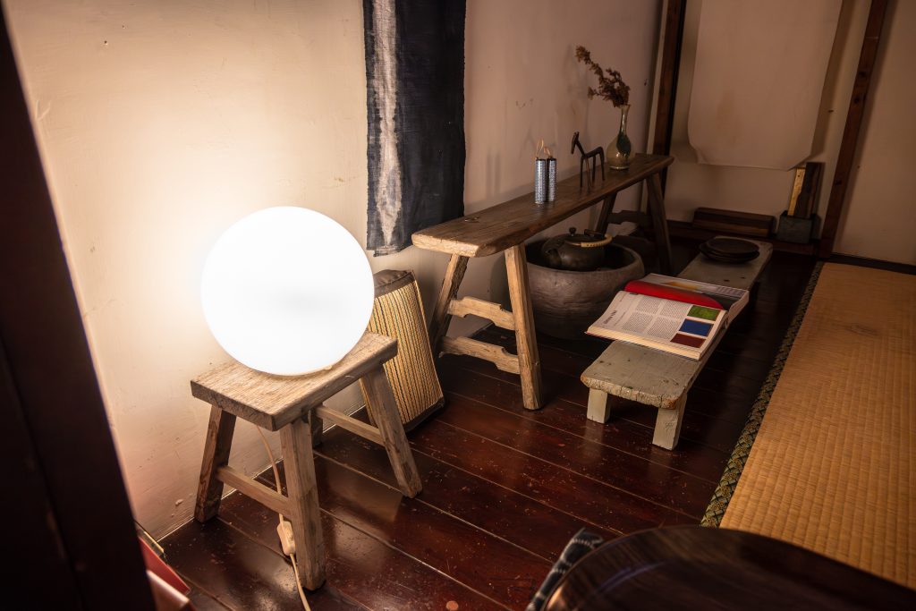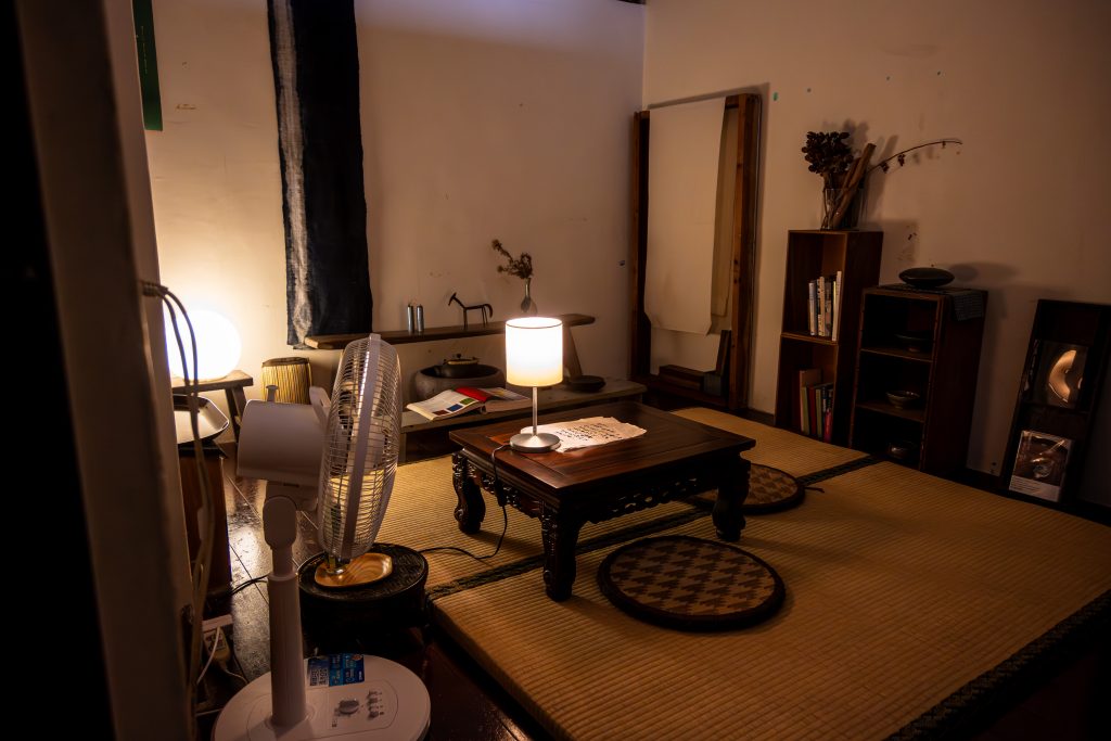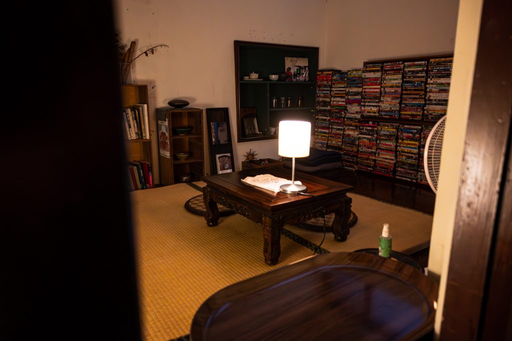 最後一間房間,是一個日式和室,木地板、草蓆、幾張坐墊,配上一個矮茶几,昏黃的室內空間,但人感受到淡淡的禪意。