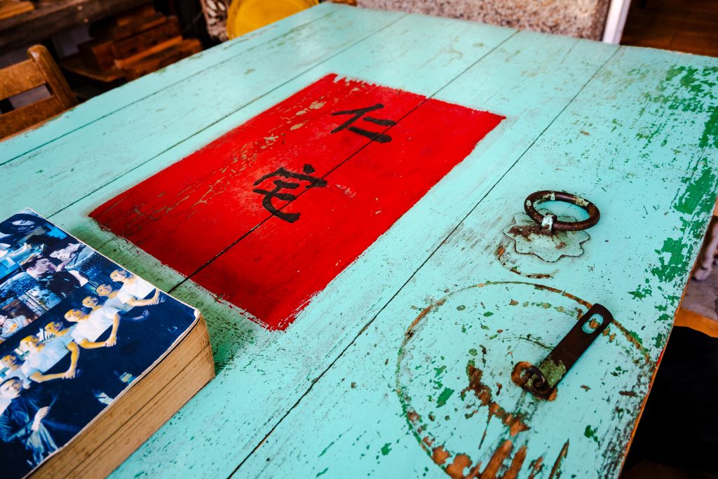 下午茶喝到一半,我就疑惑桌上怎麼有拉環、門鎖,於是我稍微挪動了桌上的書,發現原來這張桌子原是「仁宅」大門,島二哥到底是去那裡拆家!需然把大門給搬過來了…