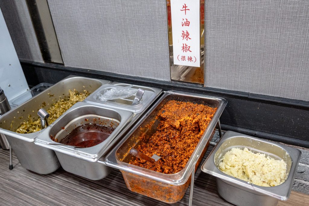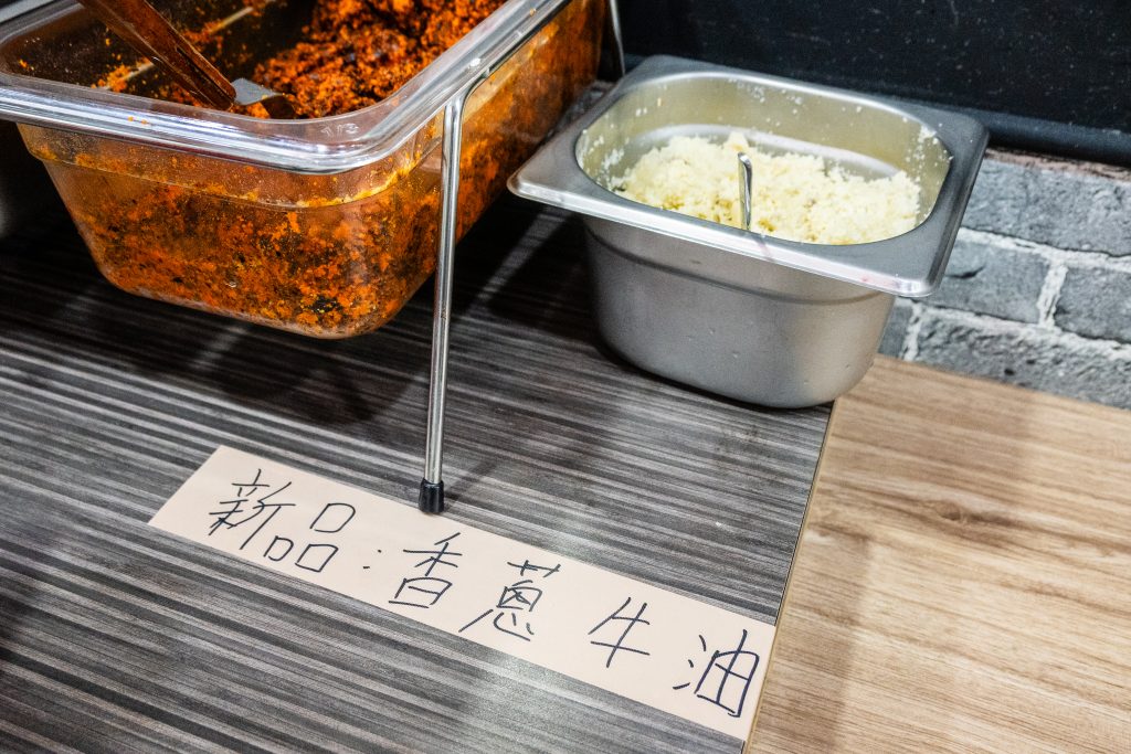 主食沾醬、佐料方面也是選項豐富,有酸菜、牛油辣椒、香蔥牛油、生蒜頭可選,可惜胡哥我這次吃的是「麻油手沖牛肉麵」,比較搭不上這些佐料,下次回訪時再把心得補給大家。