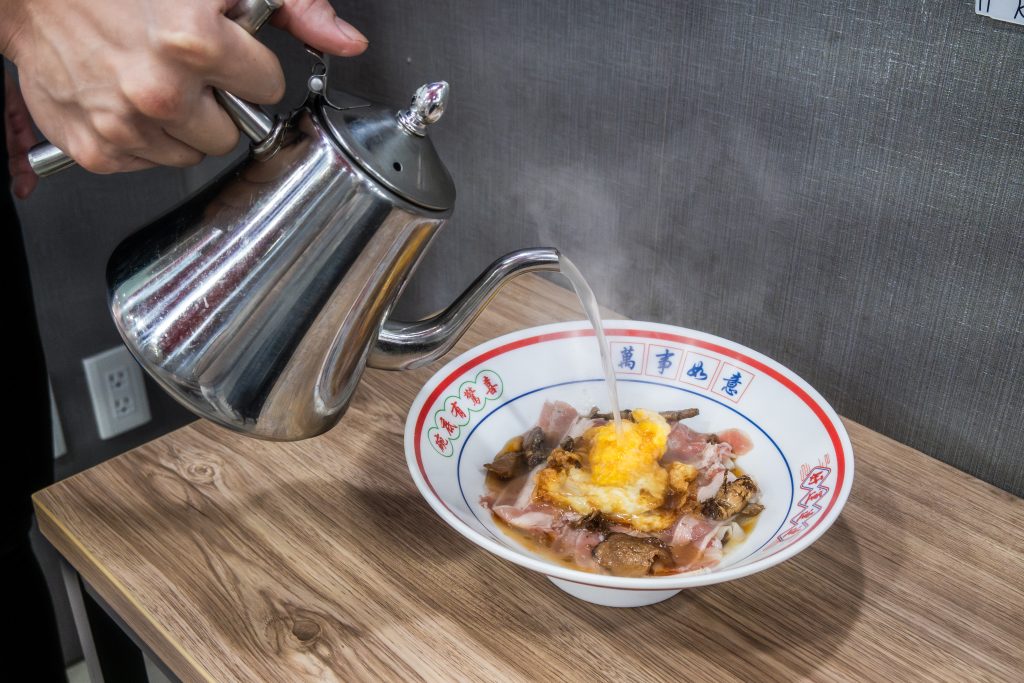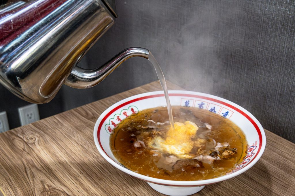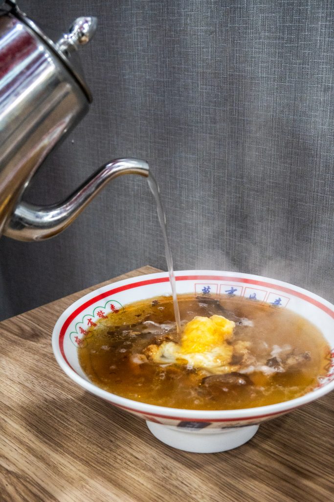 刀削麵、生牛肉片、薑片、炸蛋層層疊起浸泡於麻油裡面,熬製許久的牛骨高湯淋下,麻油香、牛油香隨著高溫手沖融入湯頭裡面。