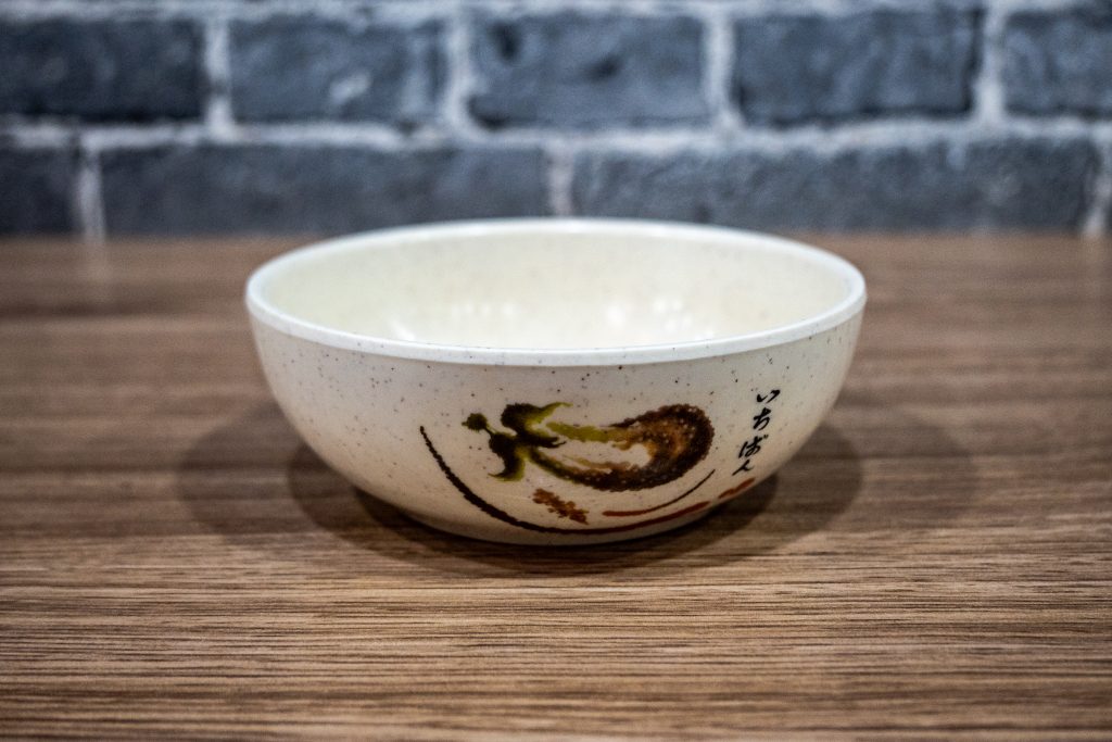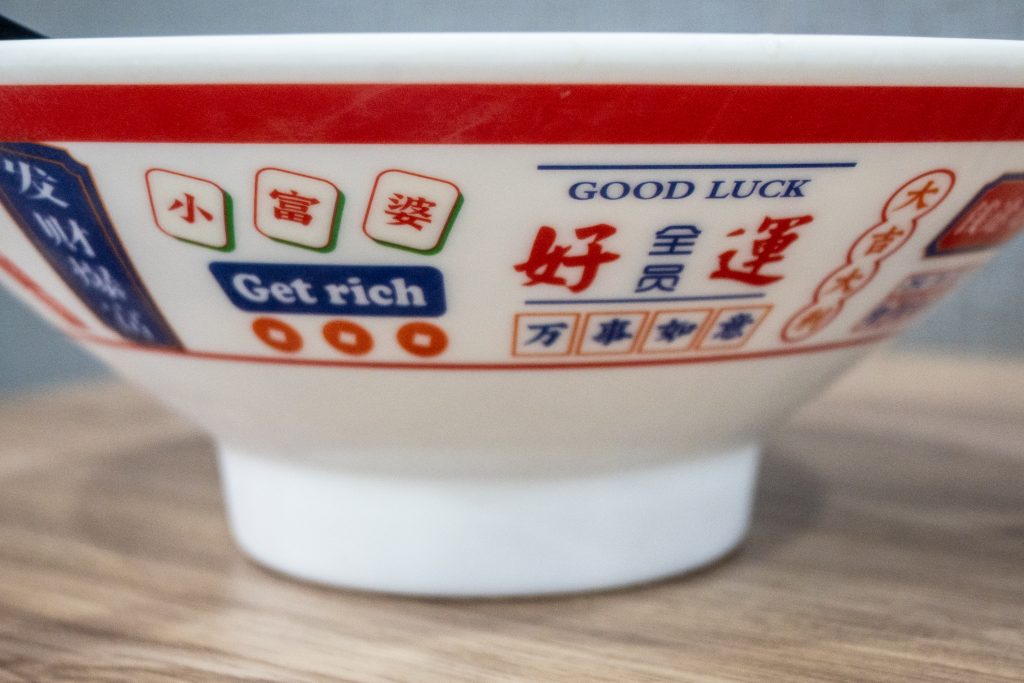 特別訂製的麵碗,碗緣印上「碗底有驚喜」五字,想要體驗「無敵風火輪」,並順走頭獎,需先把碗公吃乾抹淨,胡哥我很喜歡這減少浪費的設計。